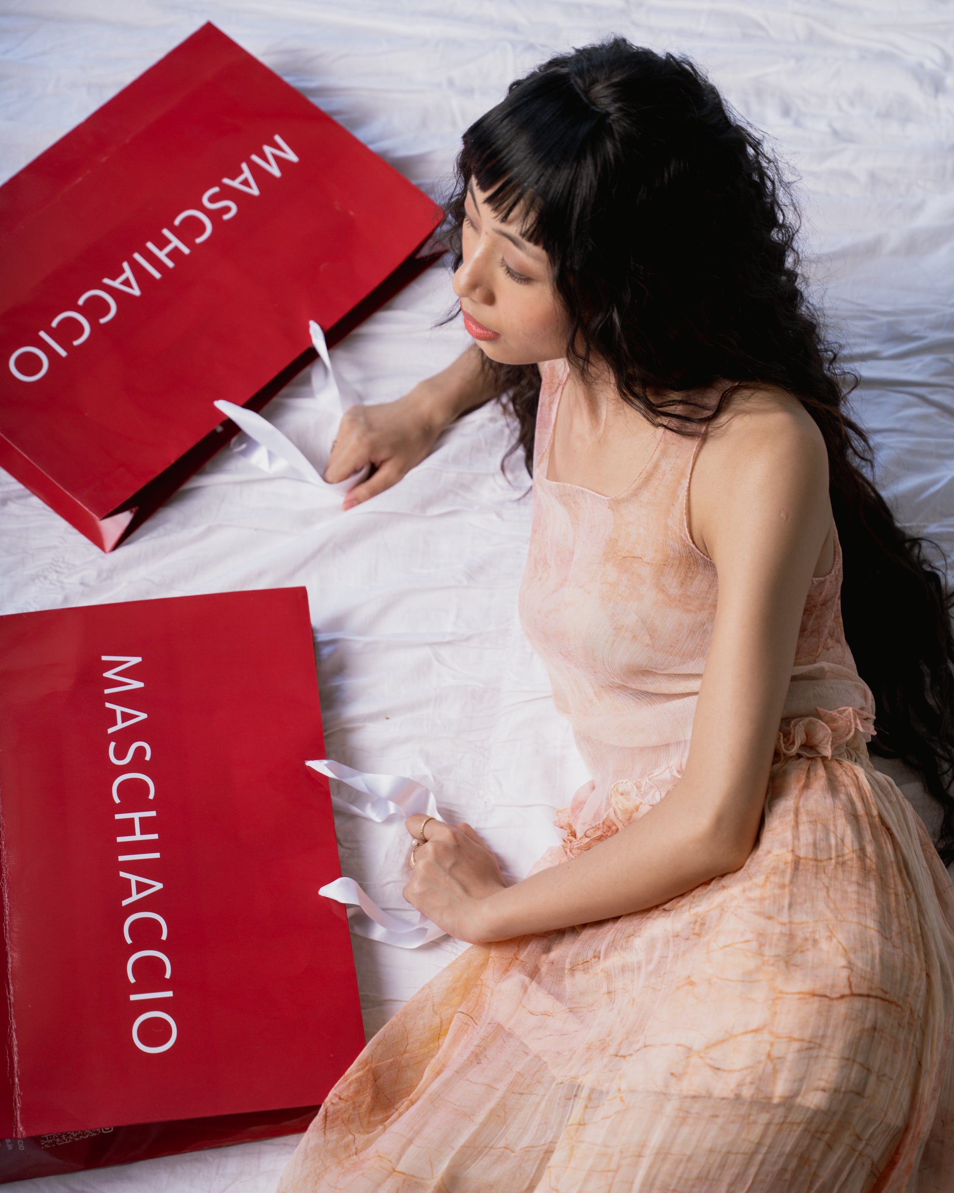 She lies among her Maschiaccio bags like they’re lovers she no longer calls.