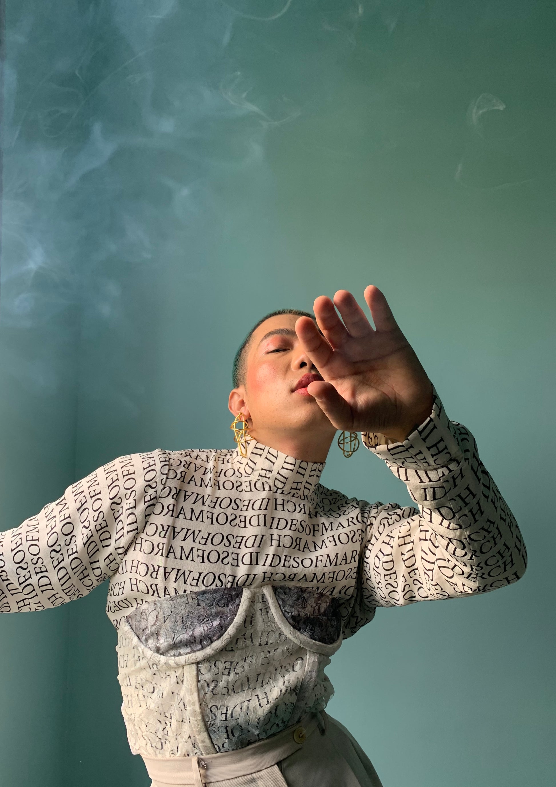The Ides of March collection narrates the assassination of Julius Caesar. It showcases the relationships between rivals, and triumphs over the romanticized notions of subjugation, war and death. The allegorical pattern on this top is the date Julius Caesar was assassinated. - 15th of March.