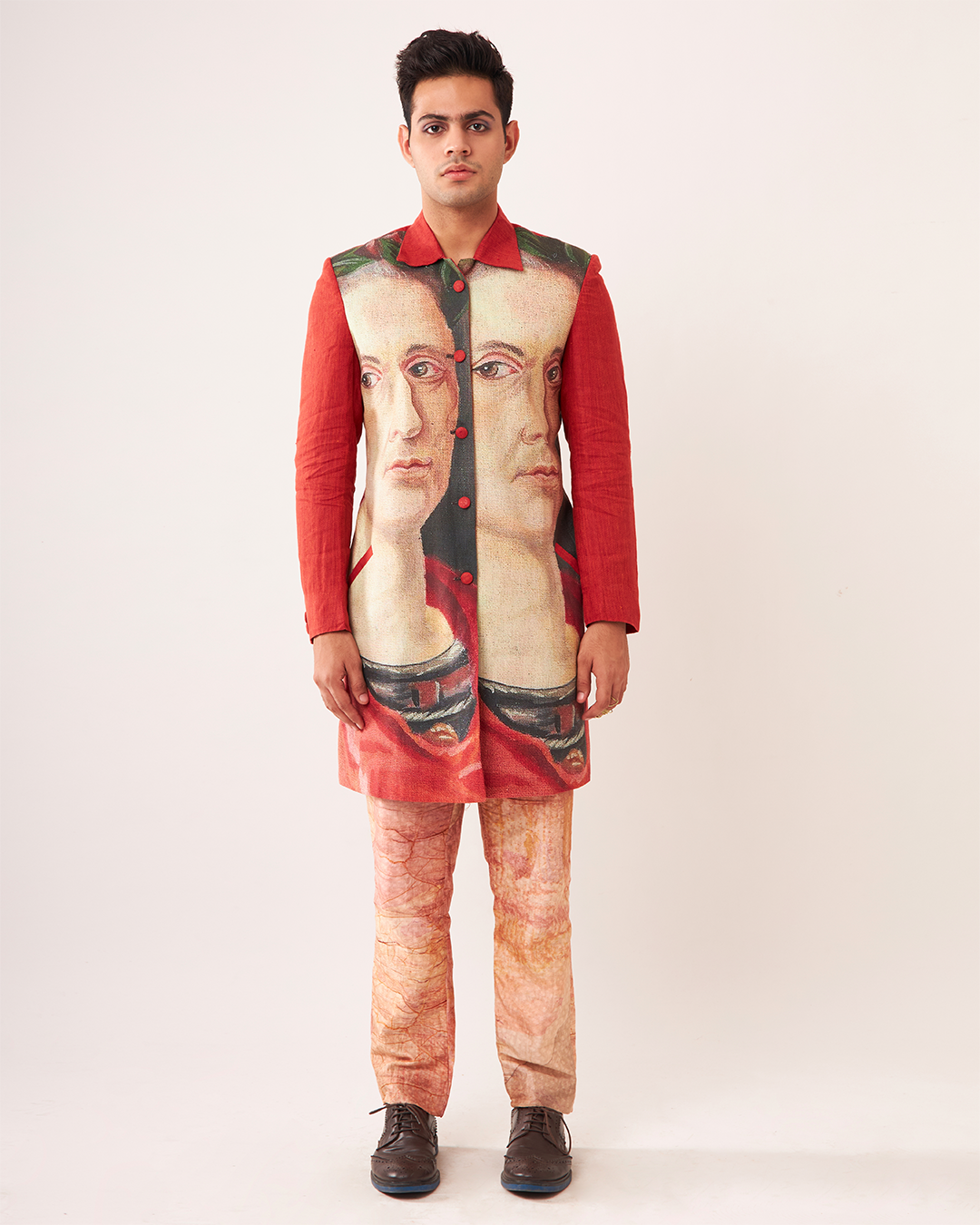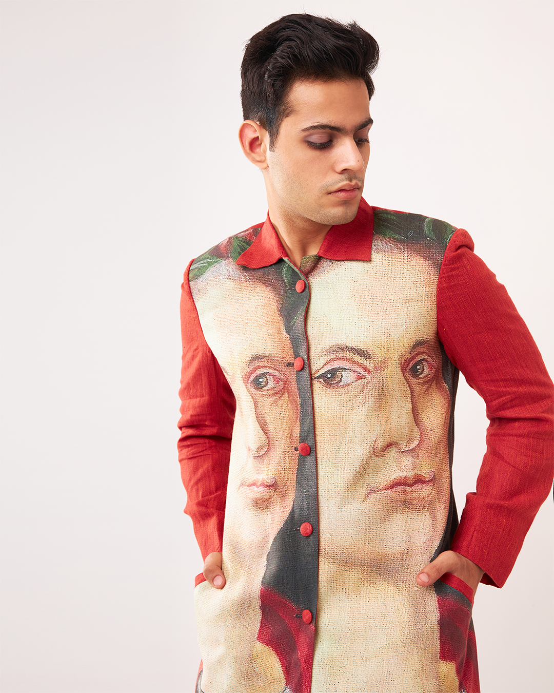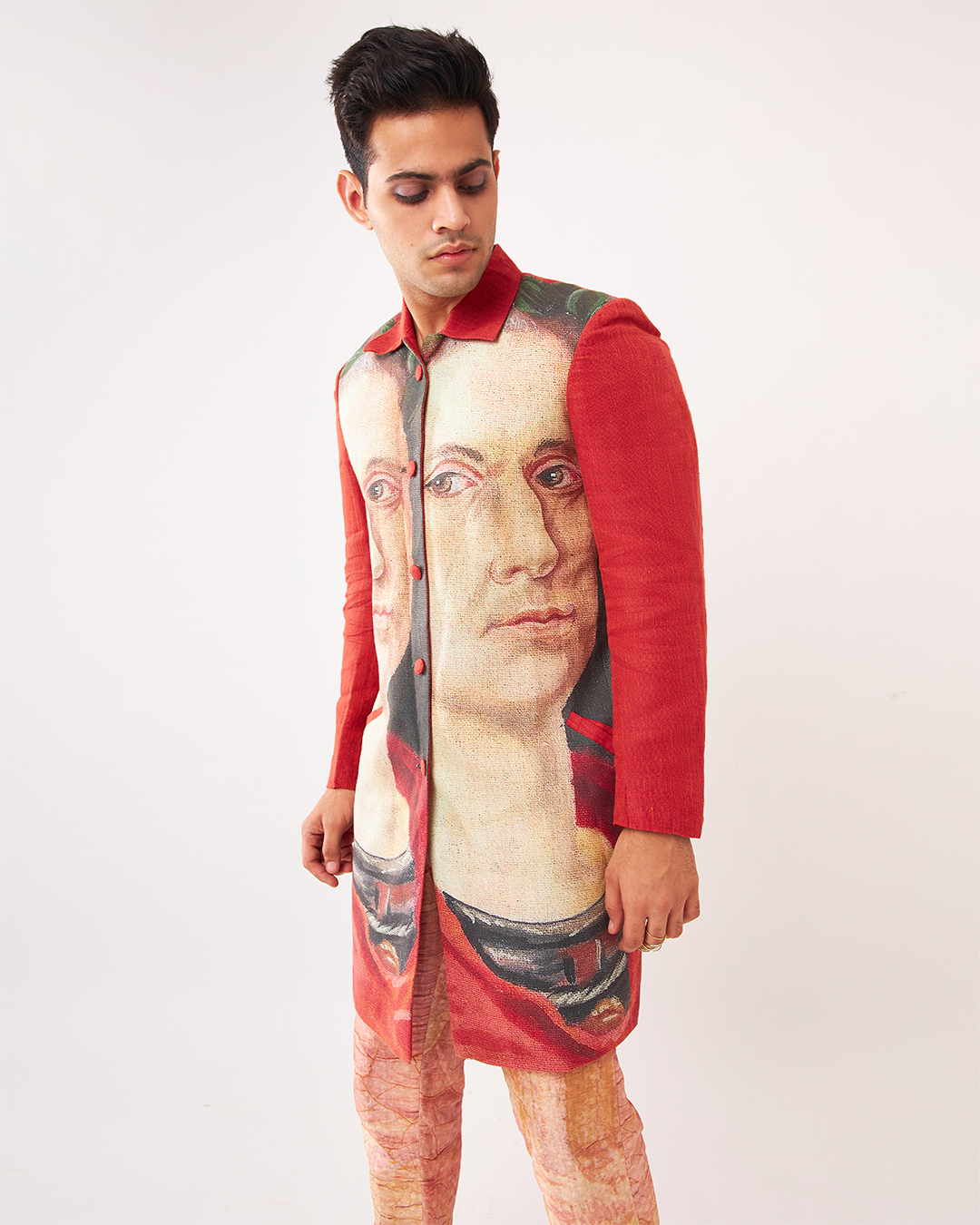 Hand painted portrait printed on line. The coat features handmade buttons, and two front pockets.