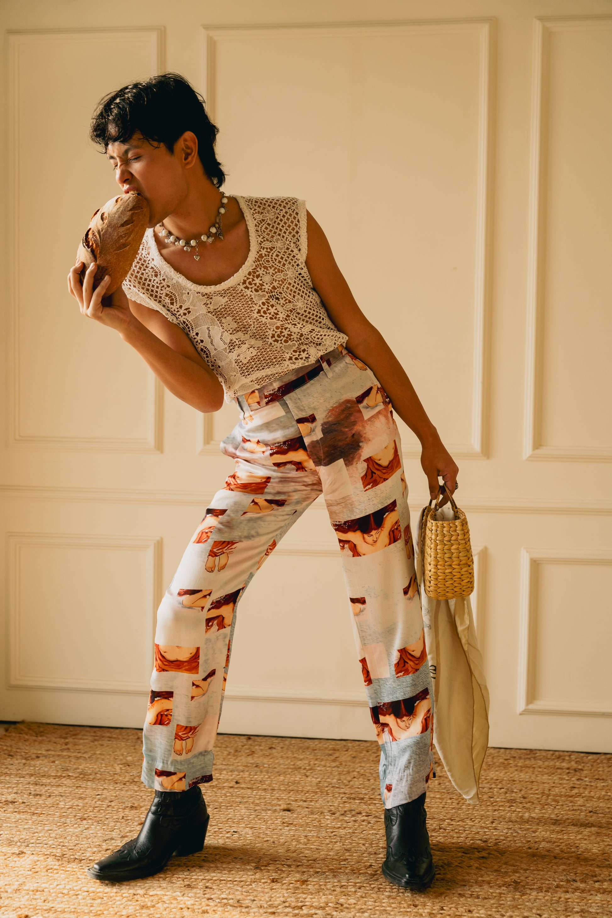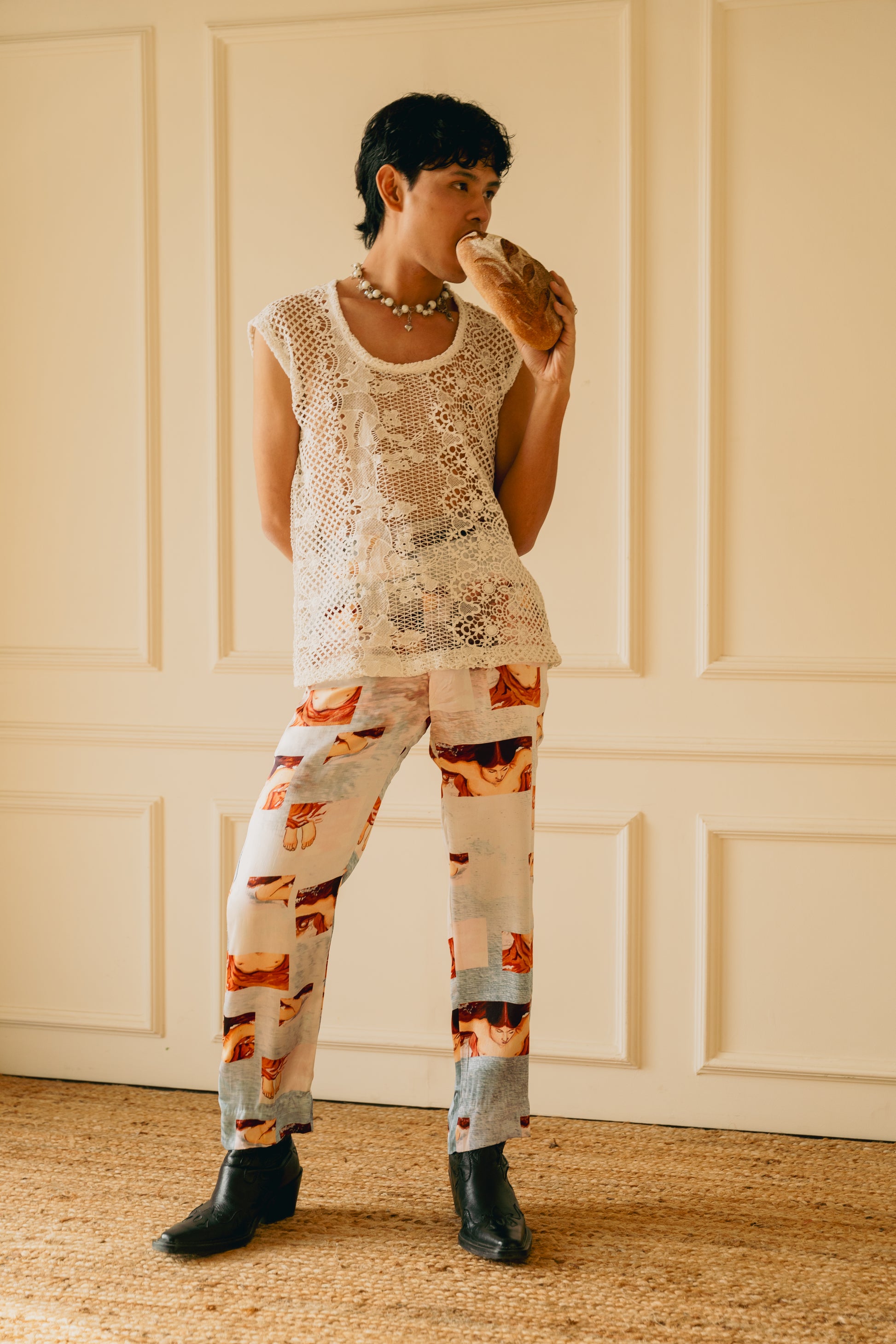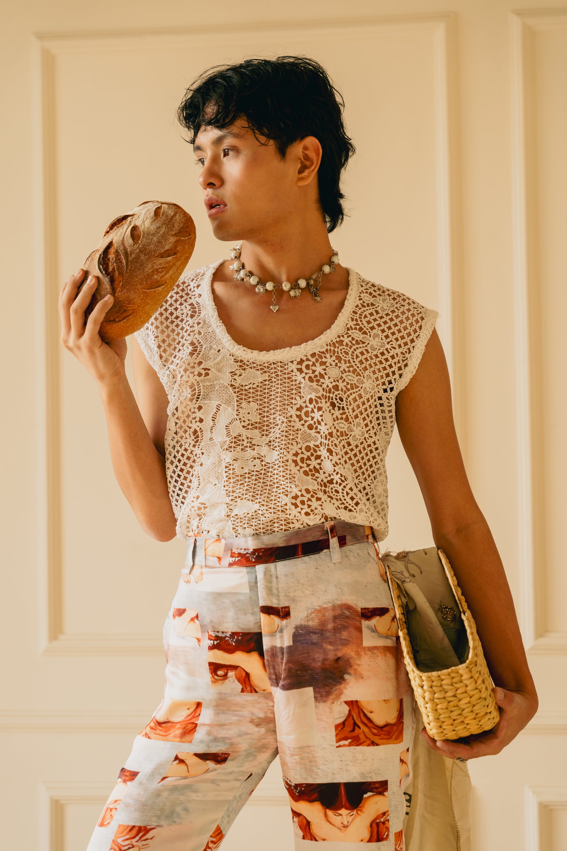 Our bespoke shirt is skillfully cut from intricate crochet fabric, resulting in a mesmerizing see-through effect that exudes elegance and individuality. Explore the art of personalized fashion like never before.