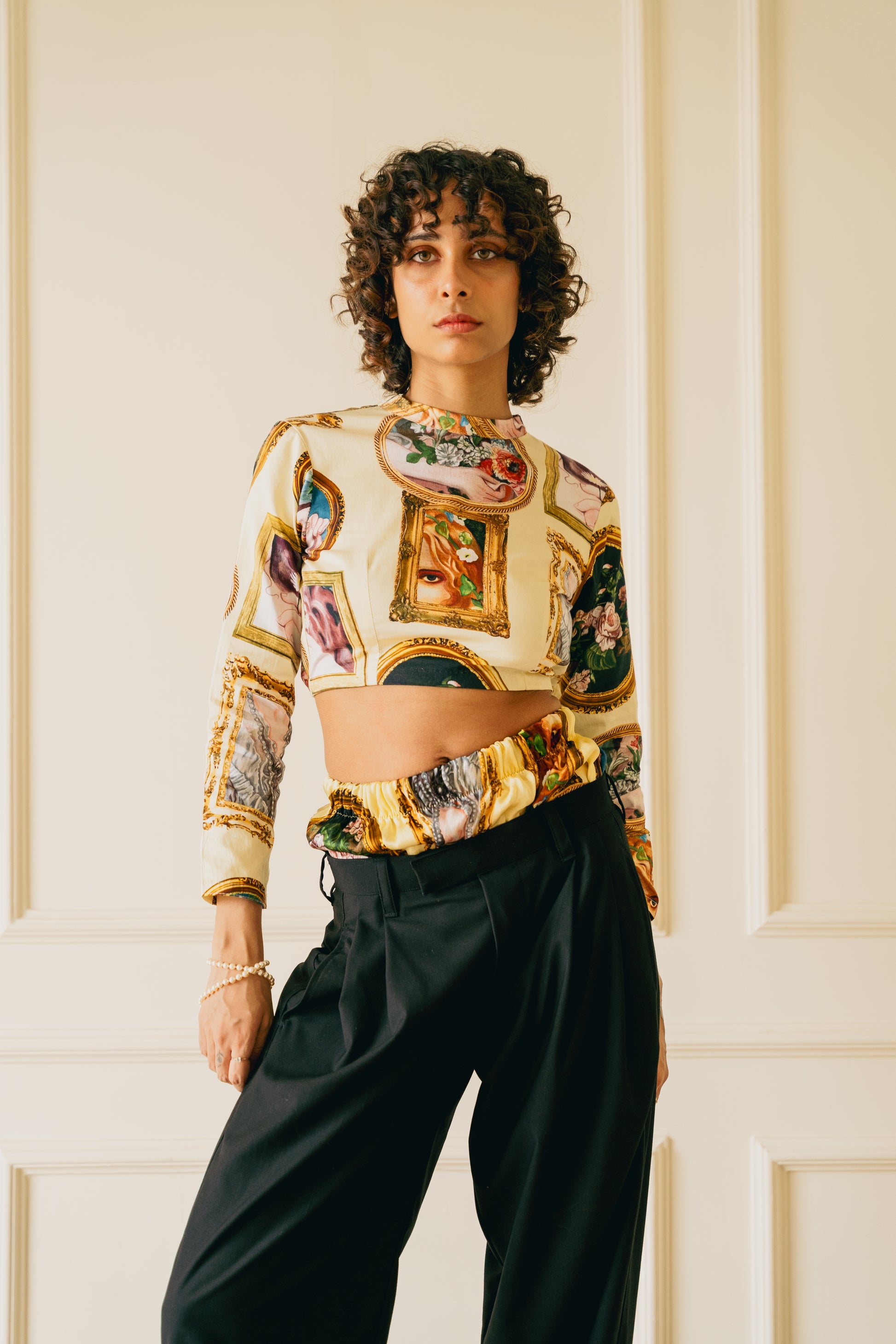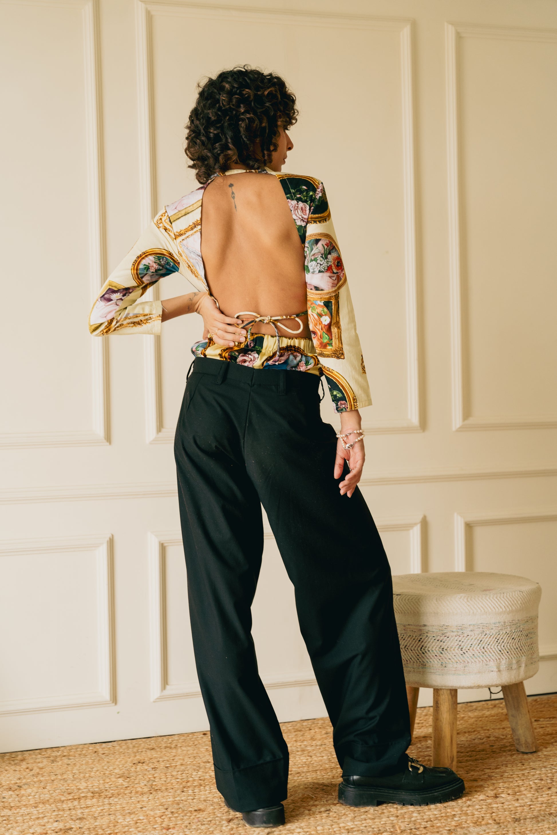 The Servilia late bloomer pants is a representation of the relationship between Julius Caesar and his alleged mistress, Servilia (Brutus’s mother). The use of elements of royal portraiture and a hint of hedonistic tension brings about a desire to evoke emotional states by appealing to the senses, and a tendency to blur distinctions between the various arts associated with grandeur, sensuous richness, and drama.