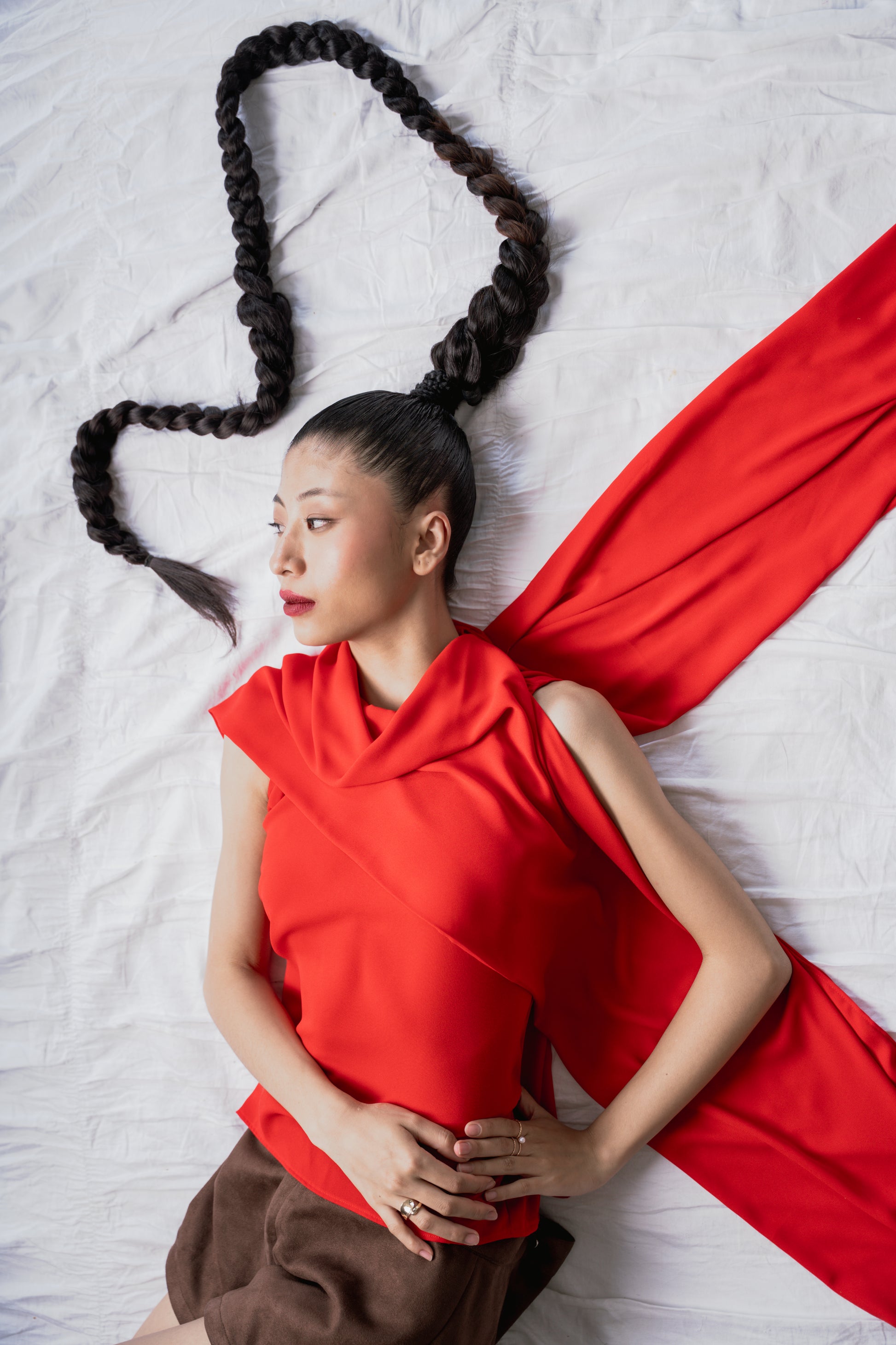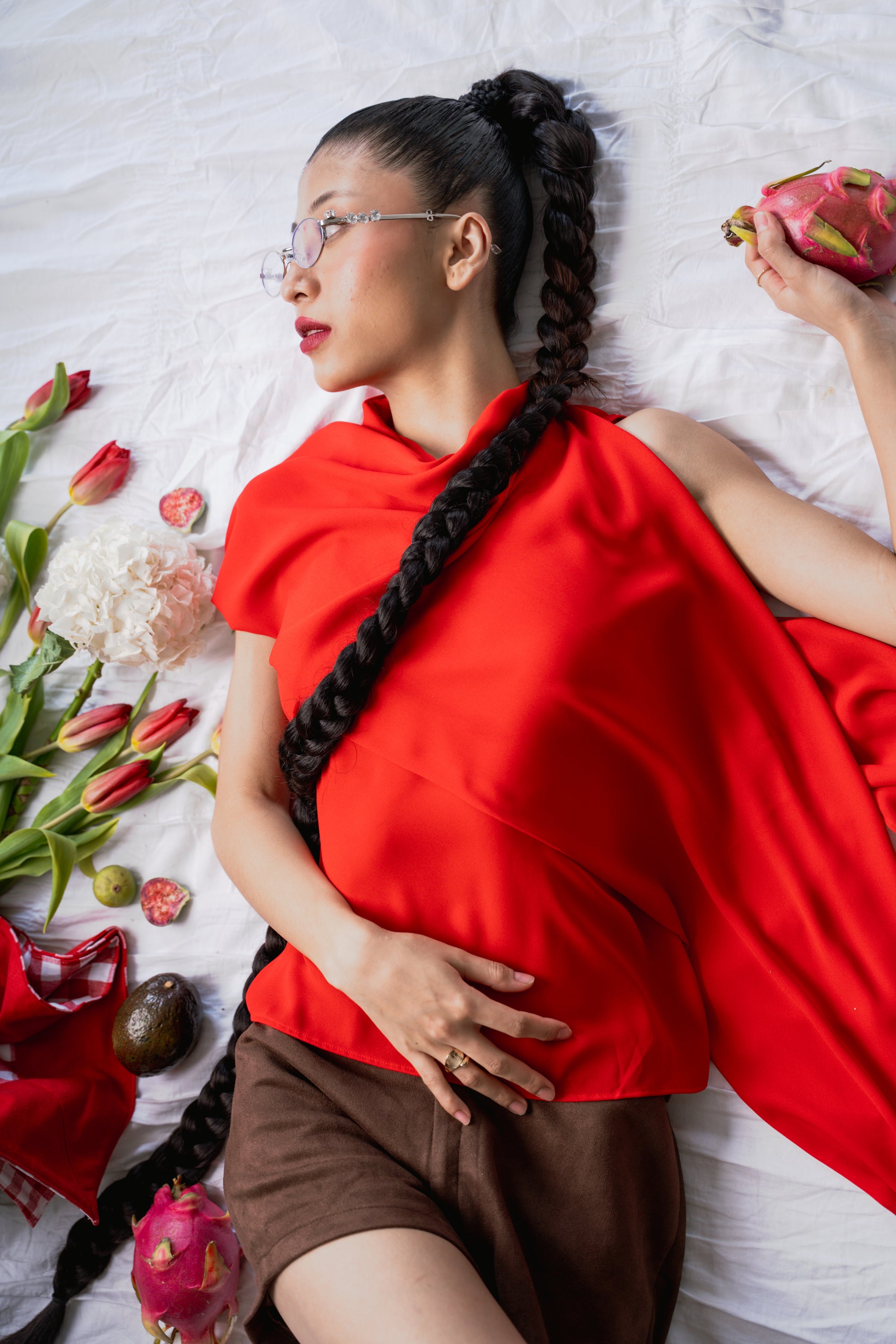 Modular silk-cotton top in poppy. Chestnut suede tailored shorts.